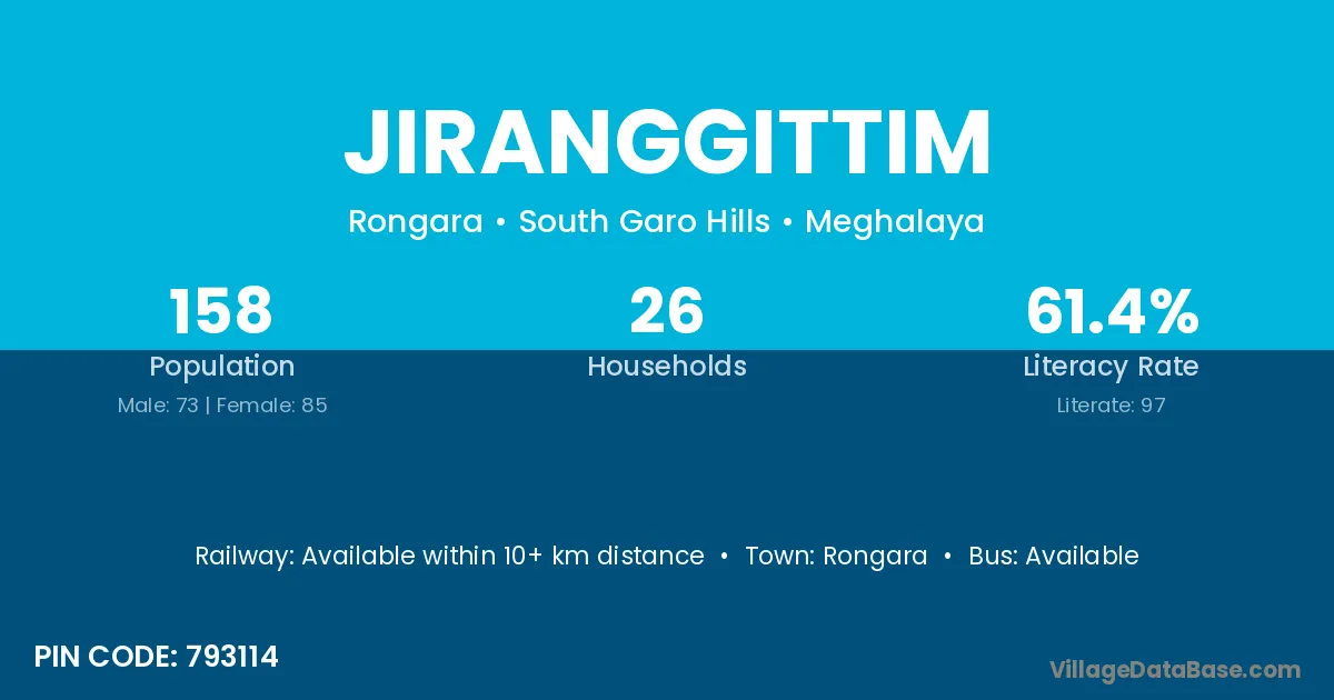 Jiranggittim village has a total population of 158 people, of which 73 are males and 85 are females.