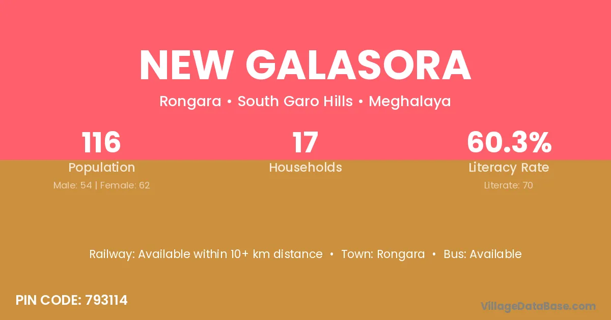 New Galasora village has a total population of 116 people, of which 54 are males and 62 are females.