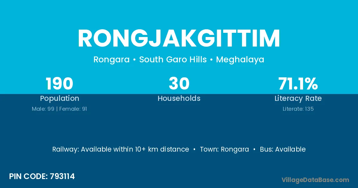 Rongjakgittim village has a total population of 190 people, of which 99 are males and 91 are females.