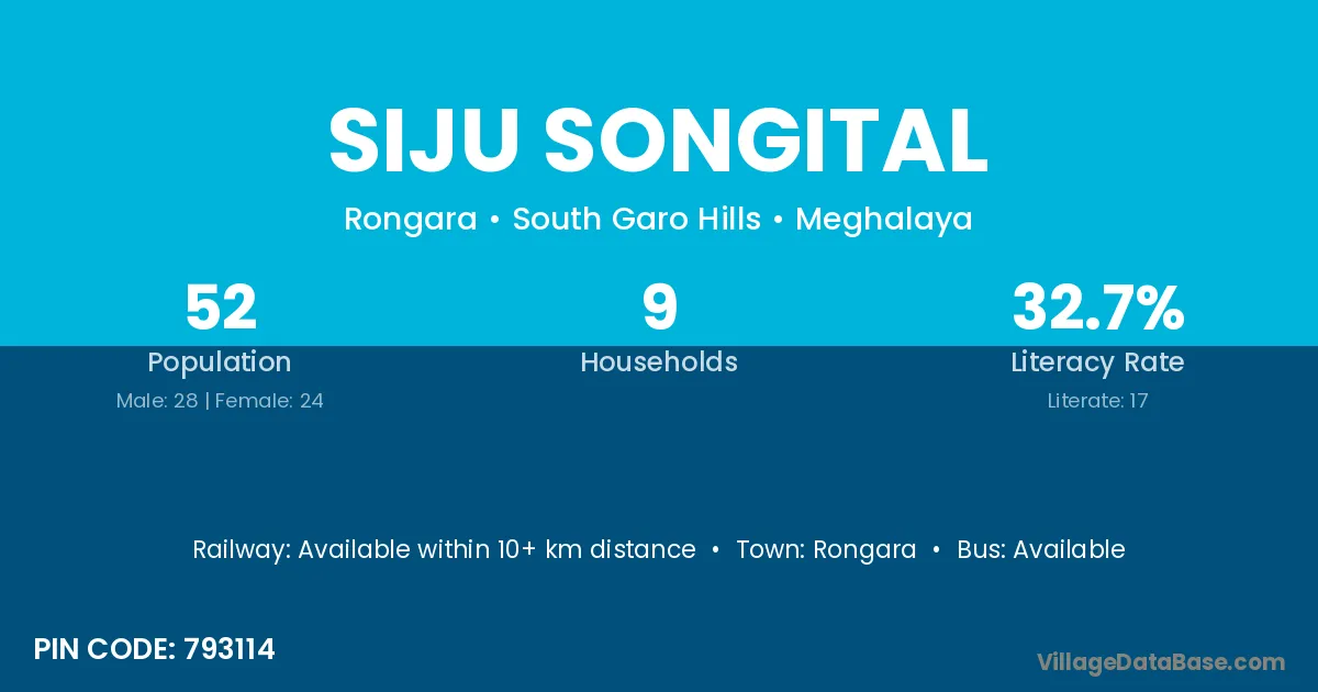The literacy rate of Siju Songital village is 32.69%. Male literacy stands at 35.71% and female literacy at 29.17%.