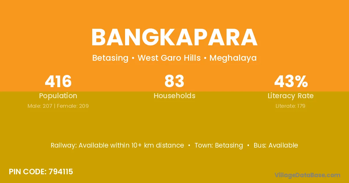 Bangkapara village has a total population of 416 people, of which 207 are males and 209 are females.