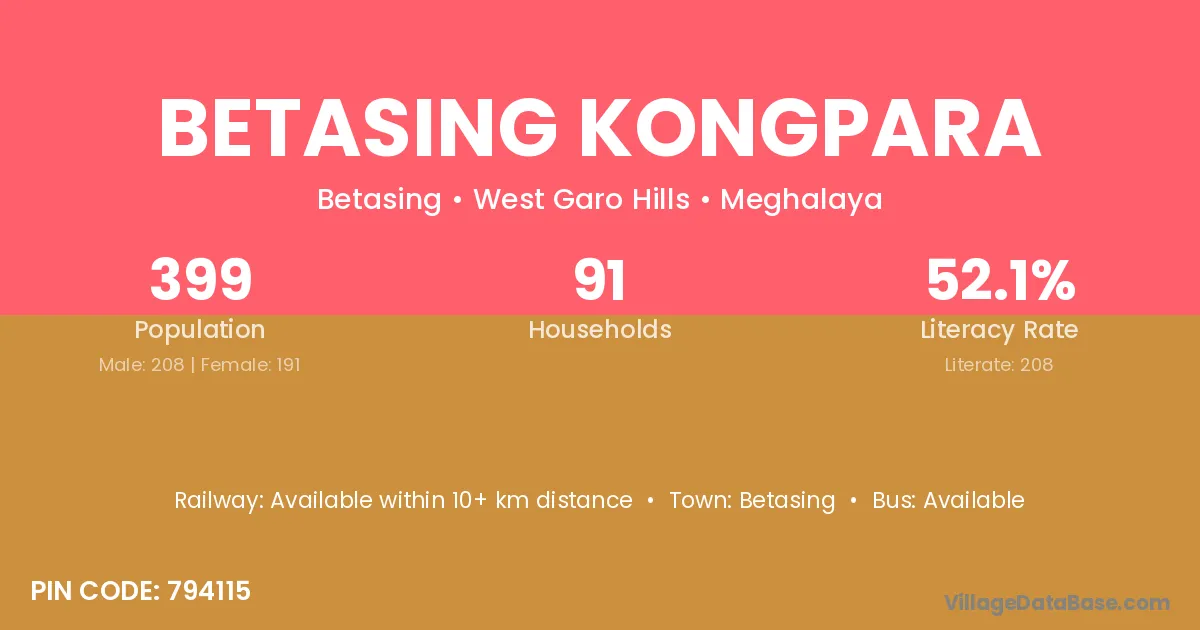 Betasing Kongpara village has a total population of 399 people, of which 208 are males and 191 are females.
