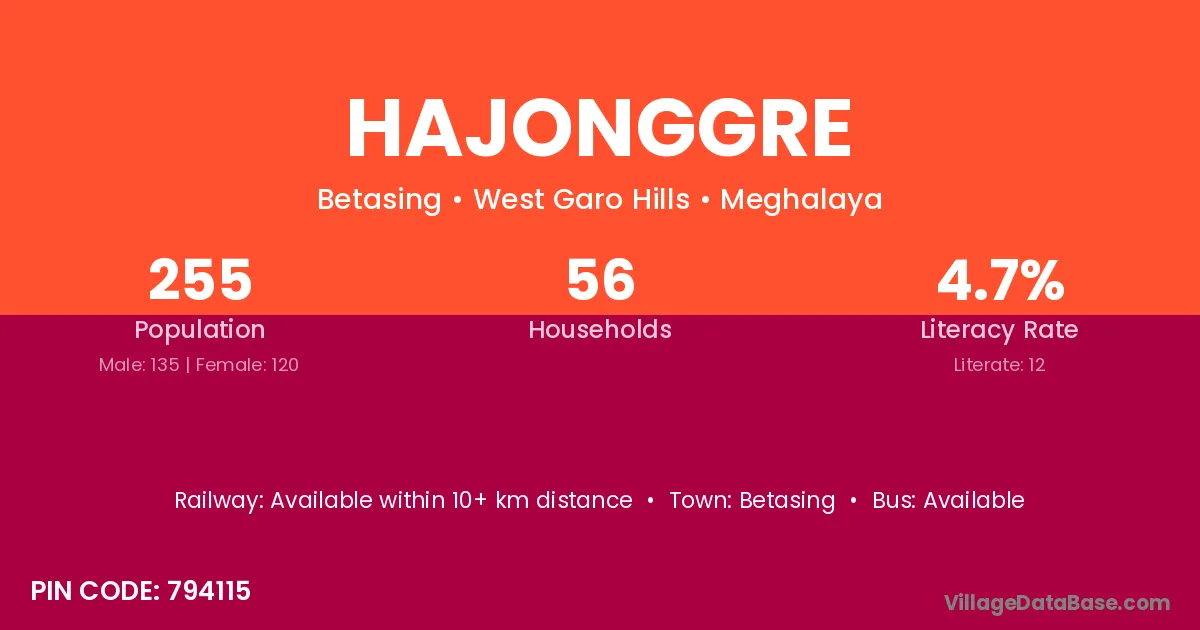 Hajonggre village has a total population of 255 people, of which 135 are males and 120 are females.