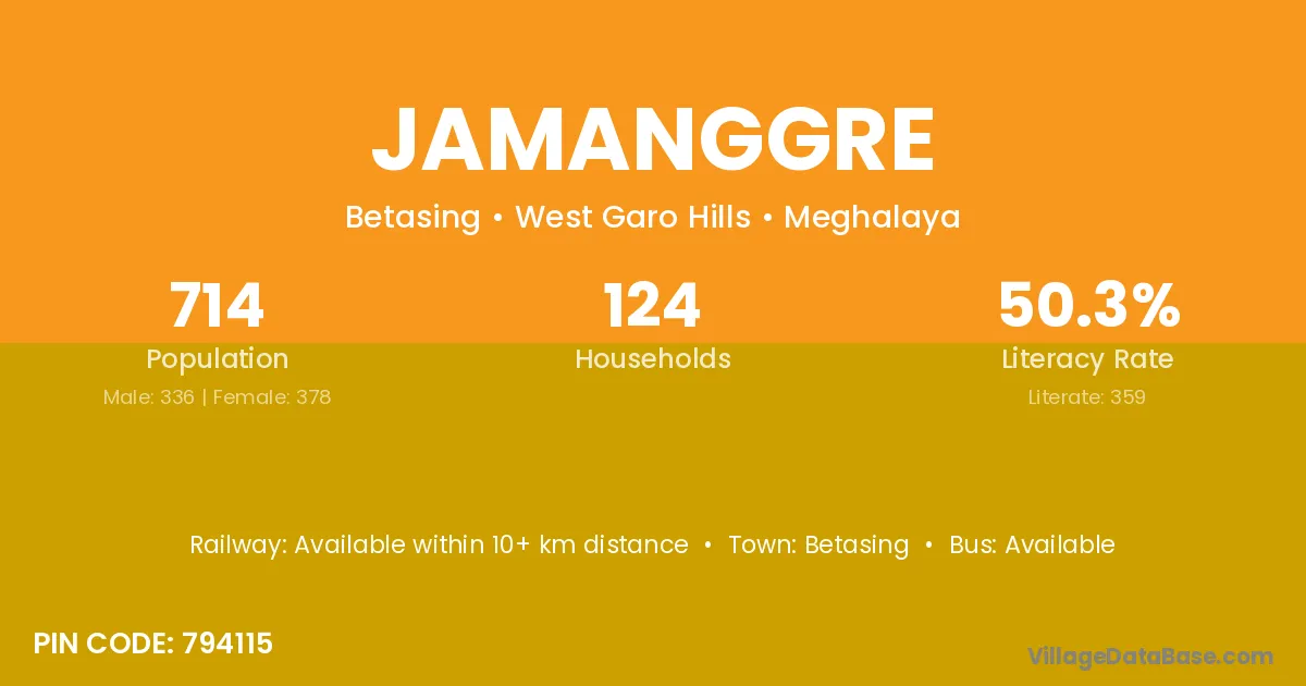 The literacy rate of Jamanggre village is 50.28%. Male literacy stands at 55.65% and female literacy at 45.50%.