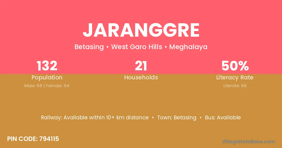 The literacy rate of Jaranggre village is 50.00%. Male literacy stands at 52.94% and female literacy at 46.88%.