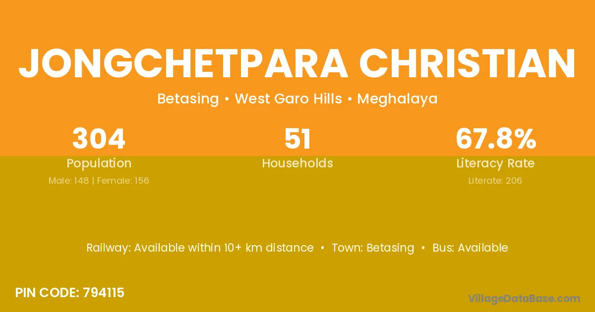 Jongchetpara Christian village has a total population of 304 people, of which 148 are males and 156 are females.