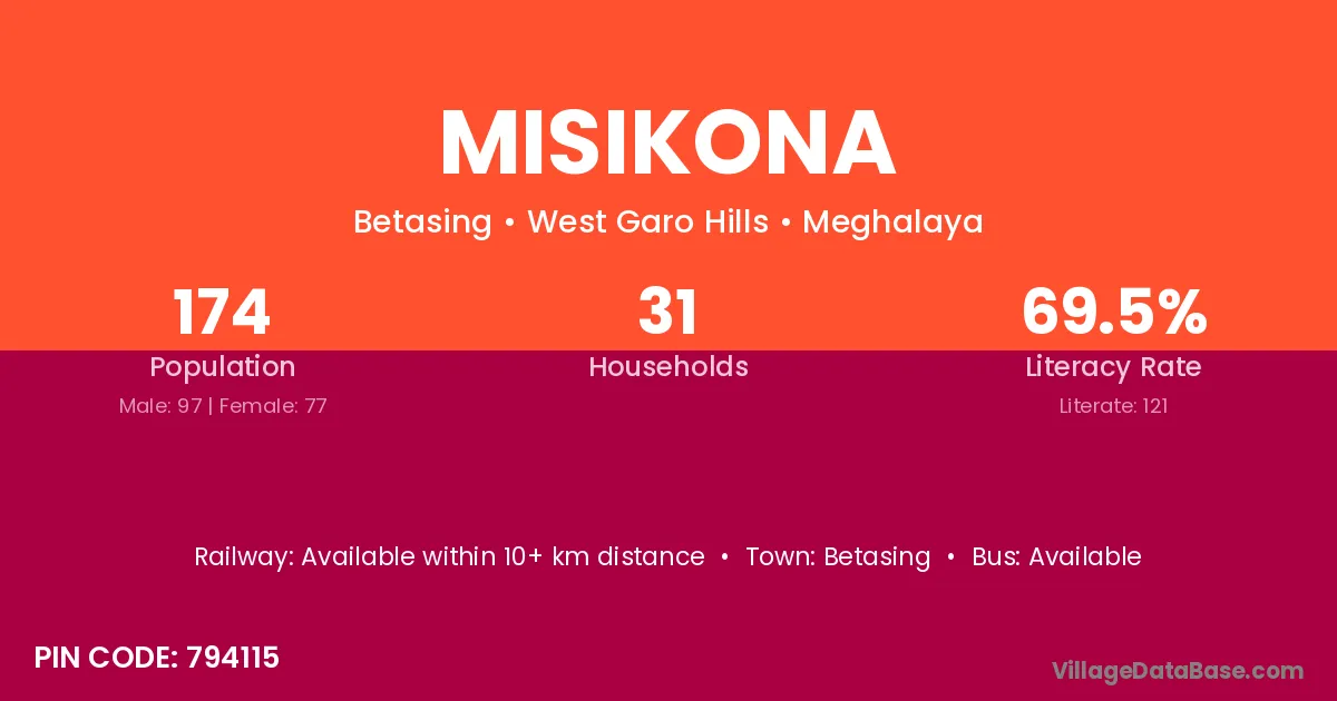 Misikona village has a total population of 174 people, of which 97 are males and 77 are females.