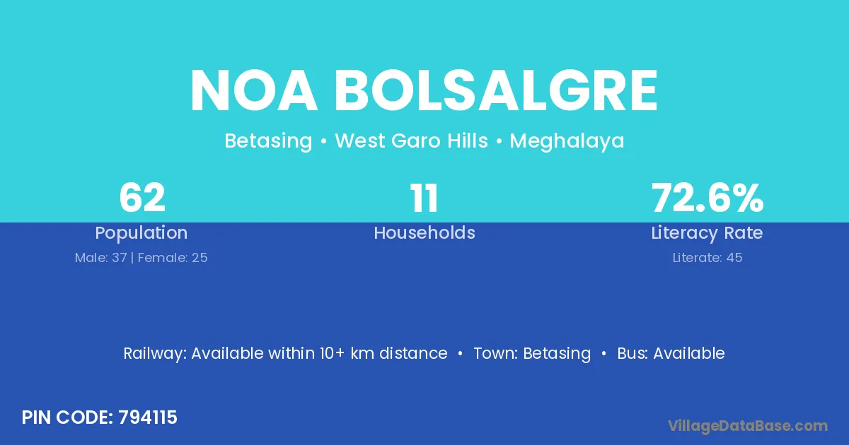 Noa Bolsalgre village has a total population of 62 people, of which 37 are males and 25 are females.