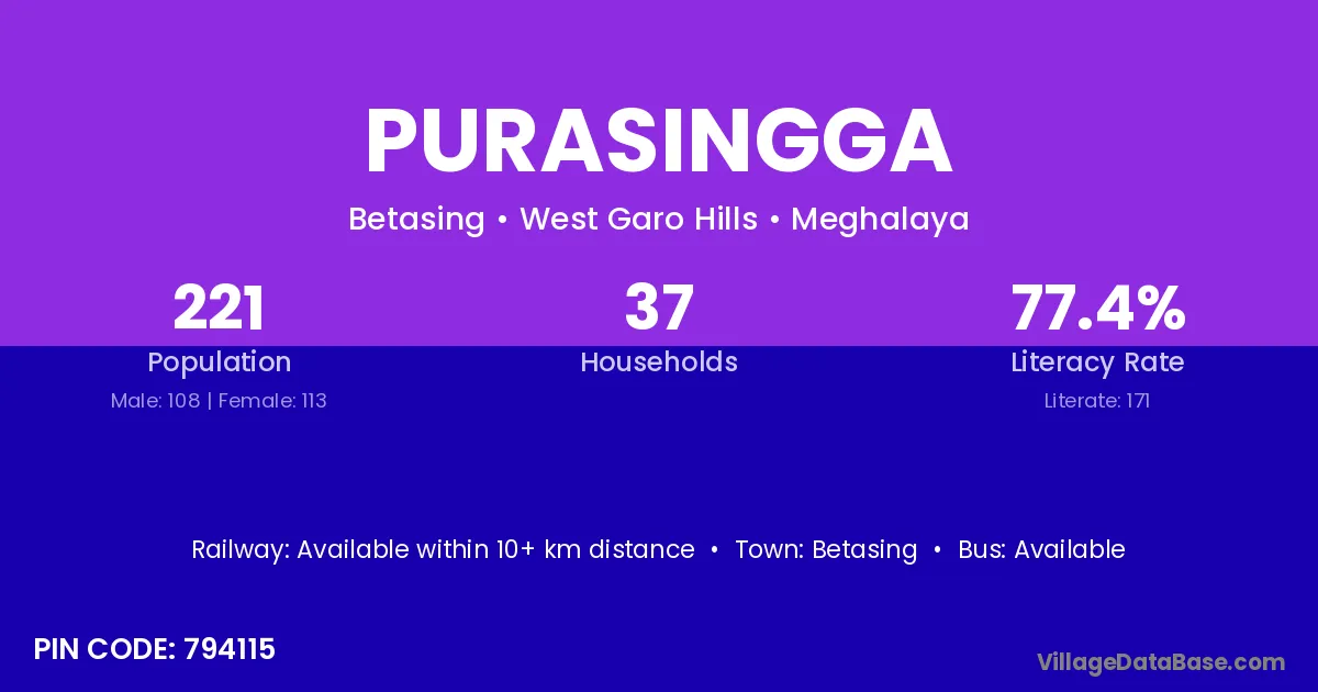Purasingga village has a total population of 221 people, of which 108 are males and 113 are females.