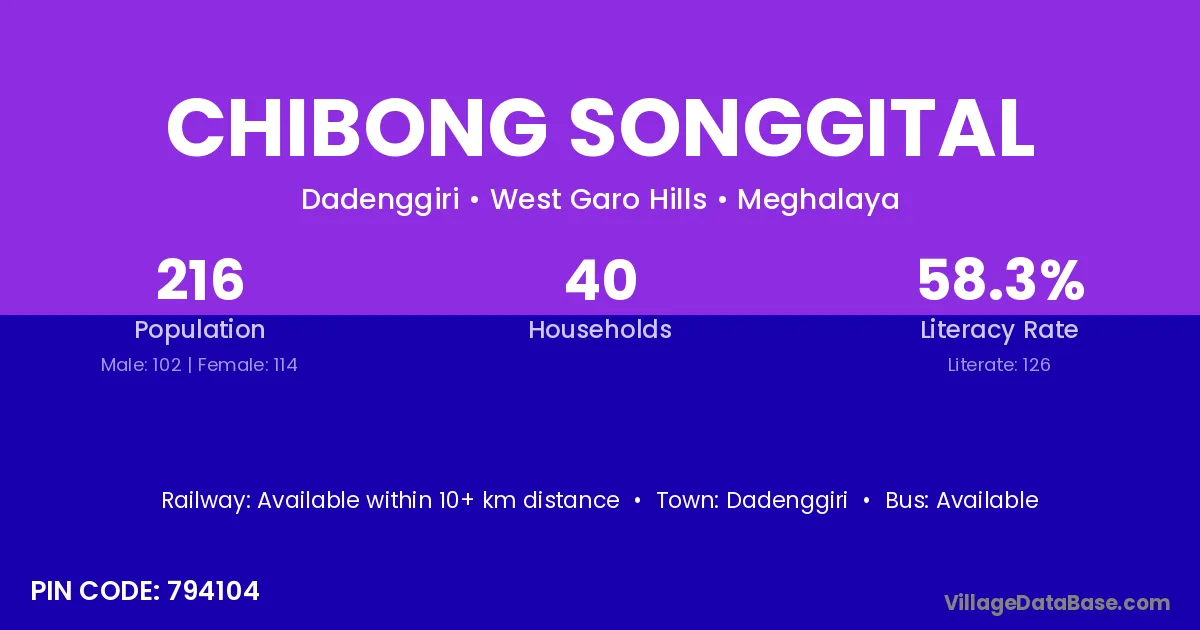 Chibong Songgital village has a total population of 216 people, of which 102 are males and 114 are females.