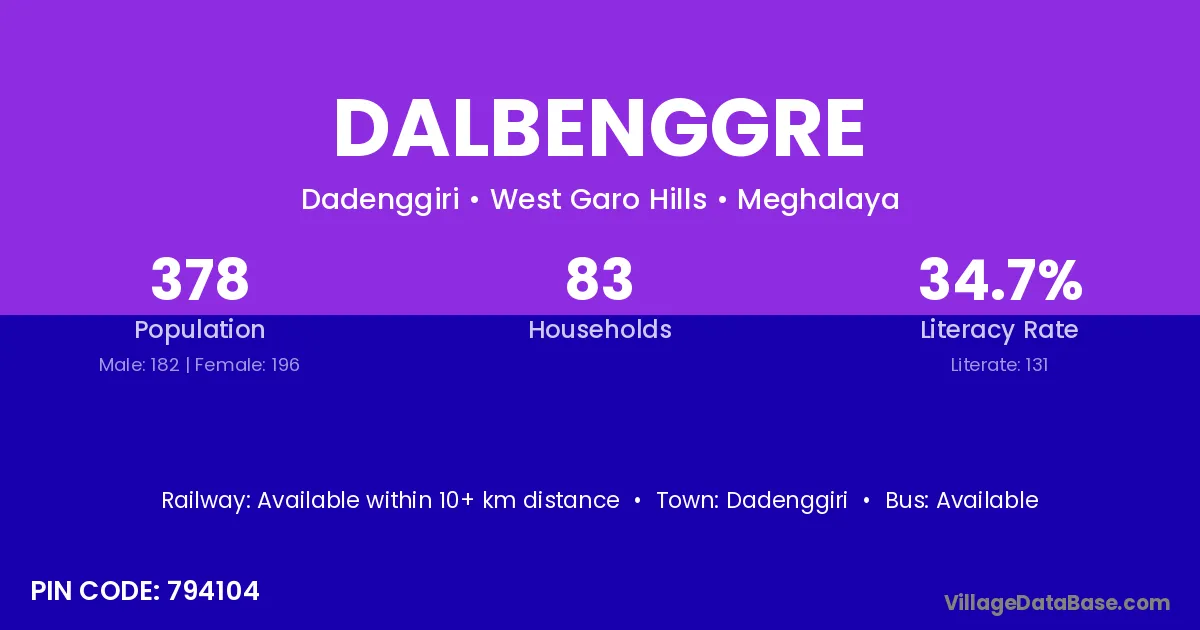 The literacy rate of Dalbenggre village is 34.66%. Male literacy stands at 58.79% and female literacy at 12.24%.