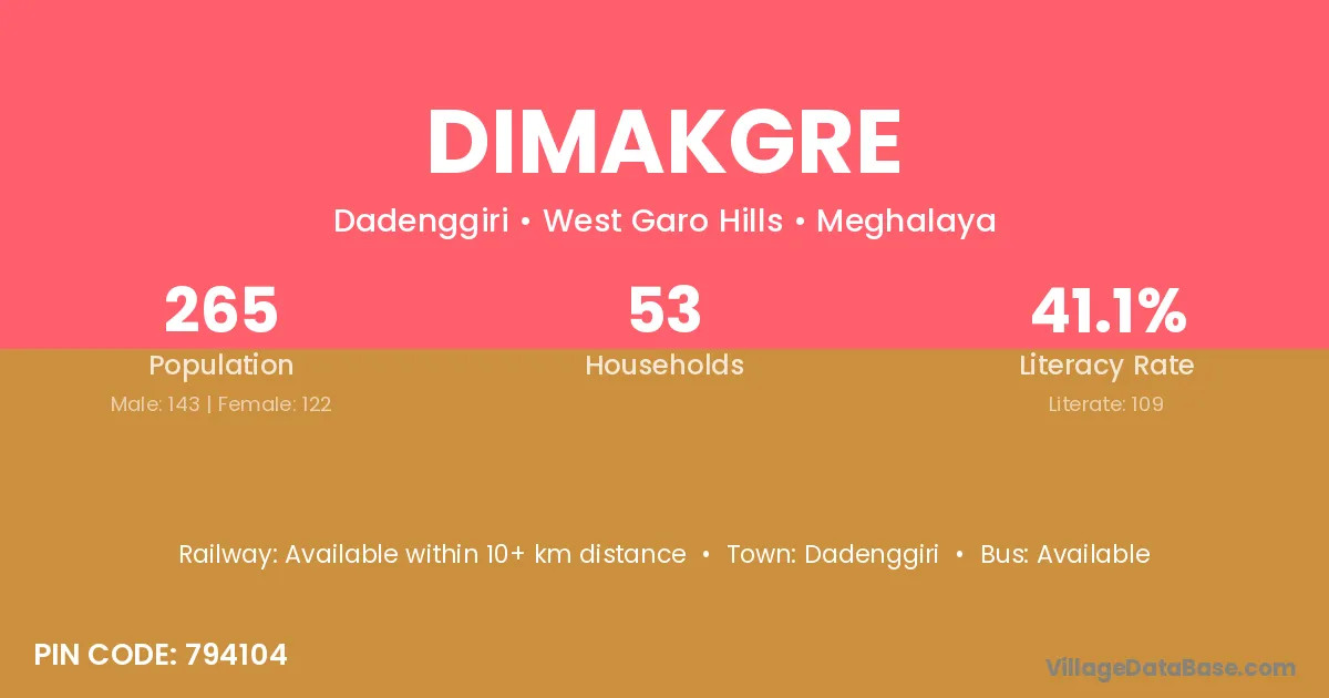 Dimakgre village has a total population of 265 people, of which 143 are males and 122 are females.