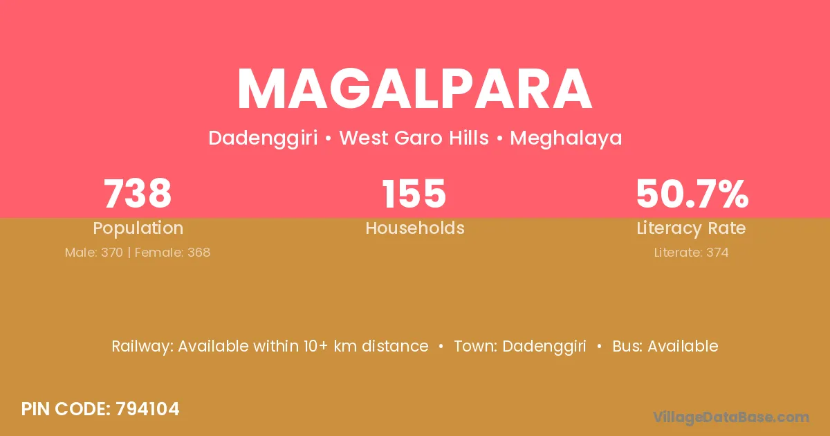 Magalpara village has a total population of 738 people, of which 370 are males and 368 are females.