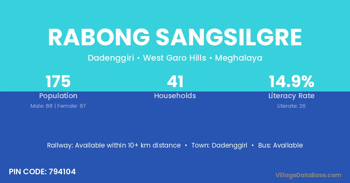 The literacy rate of Rabong Sangsilgre village is 14.86%. Male literacy stands at 14.77% and female literacy at 14.94%.