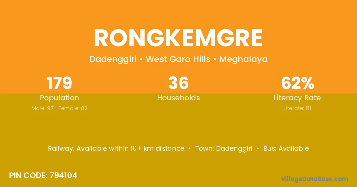 Rongkemgre village has a total population of 179 people, of which 97 are males and 82 are females.