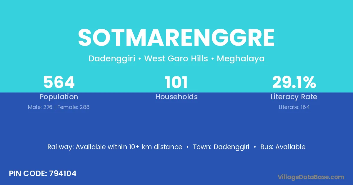 Sotmarenggre village has a total population of 564 people, of which 276 are males and 288 are females.