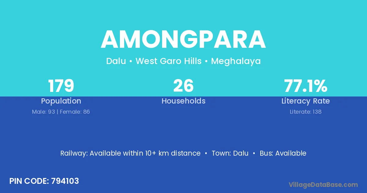 Amongpara village has a total population of 179 people, of which 93 are males and 86 are females.