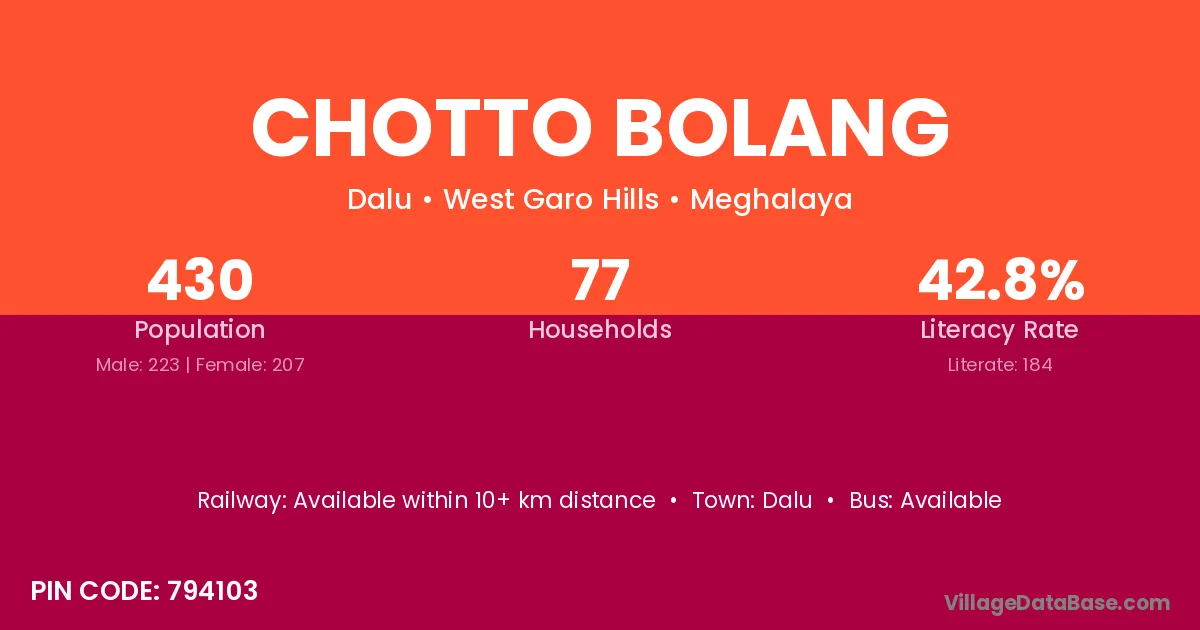Chotto Bolang village has a total population of 430 people, of which 223 are males and 207 are females.