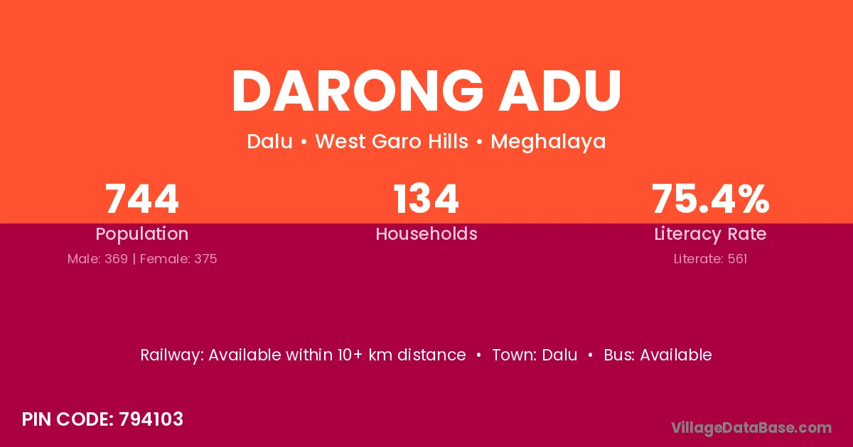 The literacy rate of Darong Adu village is 75.40%. Male literacy stands at 77.51% and female literacy at 73.33%.