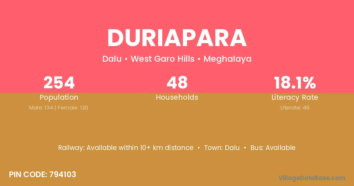 Duriapara village has a total population of 254 people, of which 134 are males and 120 are females.