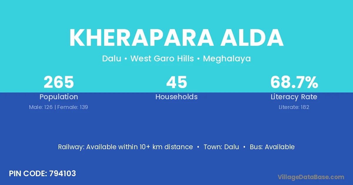 Kherapara Alda village has a total population of 265 people, of which 126 are males and 139 are females.