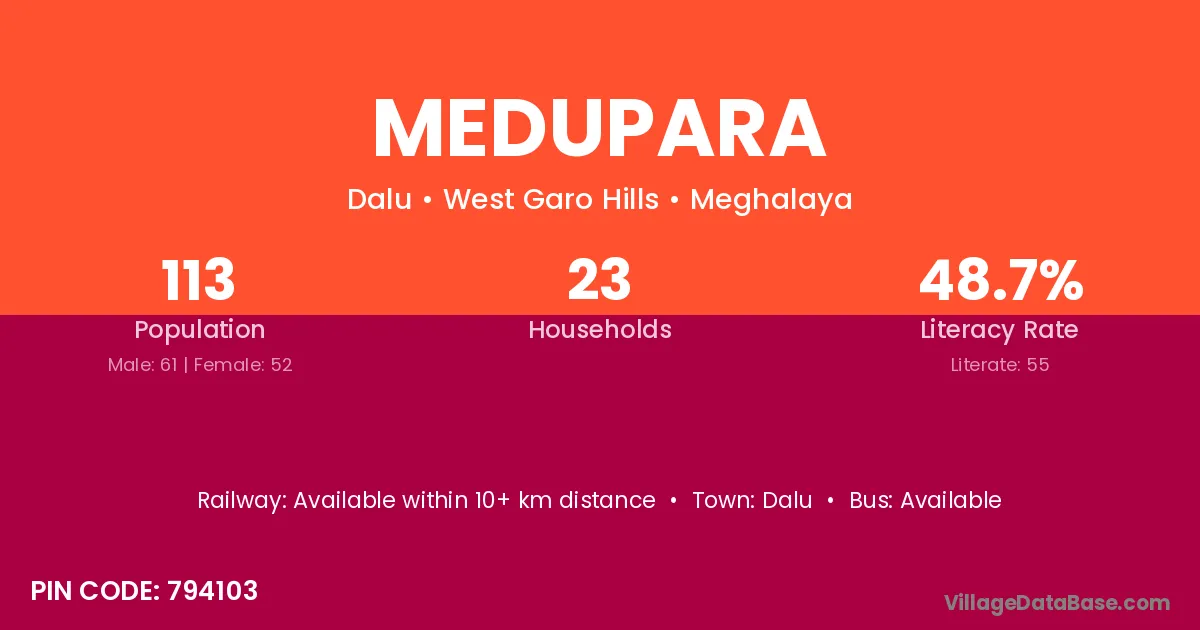 Medupara village has a total population of 113 people, of which 61 are males and 52 are females.