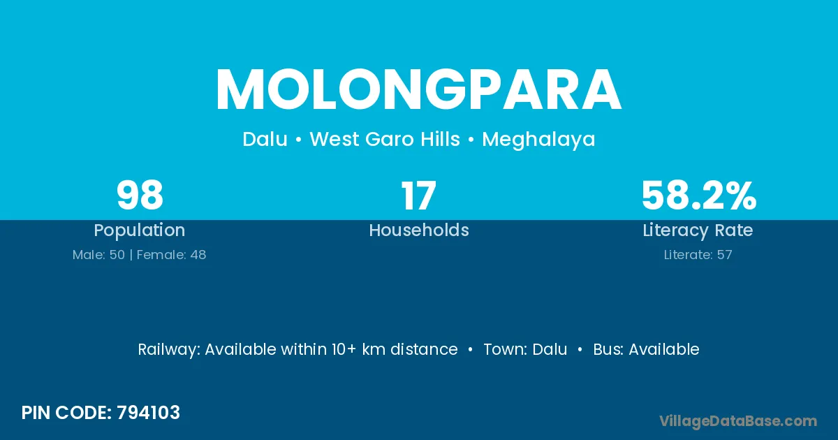 Molongpara village has a total population of 98 people, of which 50 are males and 48 are females.