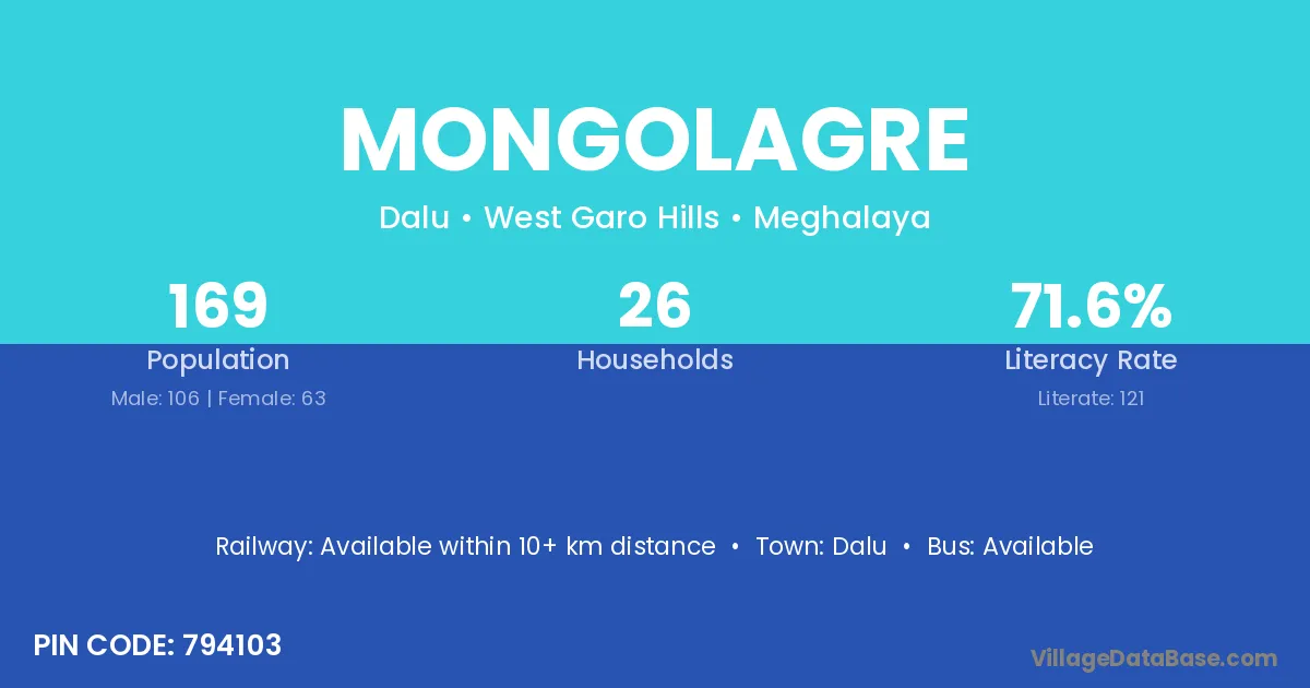 Mongolagre village has a total population of 169 people, of which 106 are males and 63 are females.