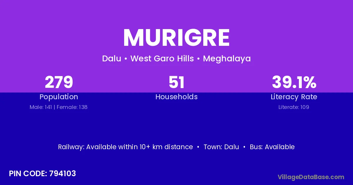 Murigre village has a total population of 279 people, of which 141 are males and 138 are females.