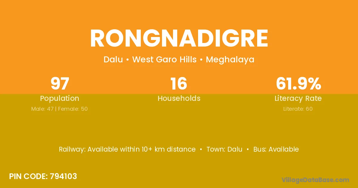 Rongnadigre village has a total population of 97 people, of which 47 are males and 50 are females.
