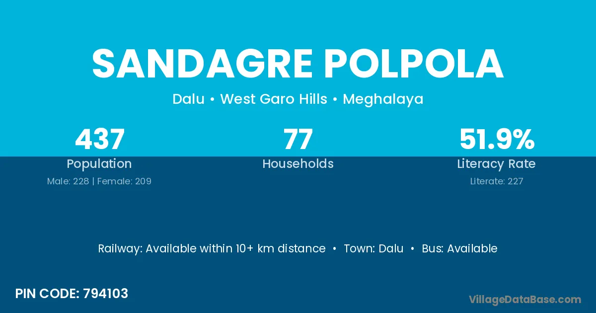 Sandagre Polpola village has a total population of 437 people, of which 228 are males and 209 are females.