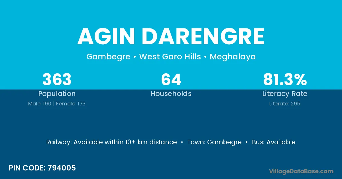 Agin Darengre village has a total population of 363 people, of which 190 are males and 173 are females.