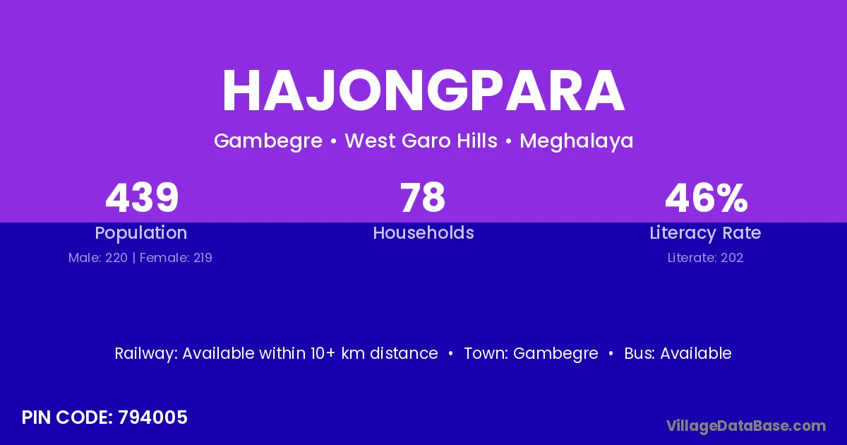 Hajongpara village has a total population of 439 people, of which 220 are males and 219 are females.
