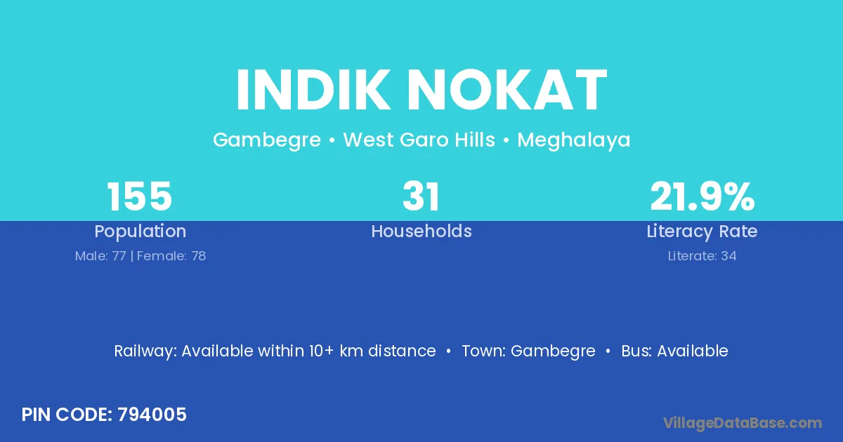 Indik Nokat village has a total population of 155 people, of which 77 are males and 78 are females.