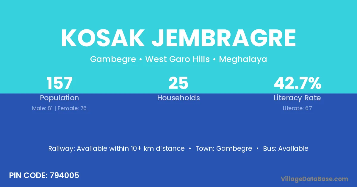 Kosak Jembragre village has a total population of 157 people, of which 81 are males and 76 are females.