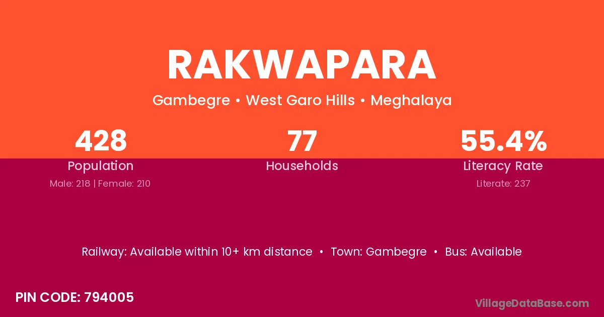 Rakwapara village has a total population of 428 people, of which 218 are males and 210 are females.