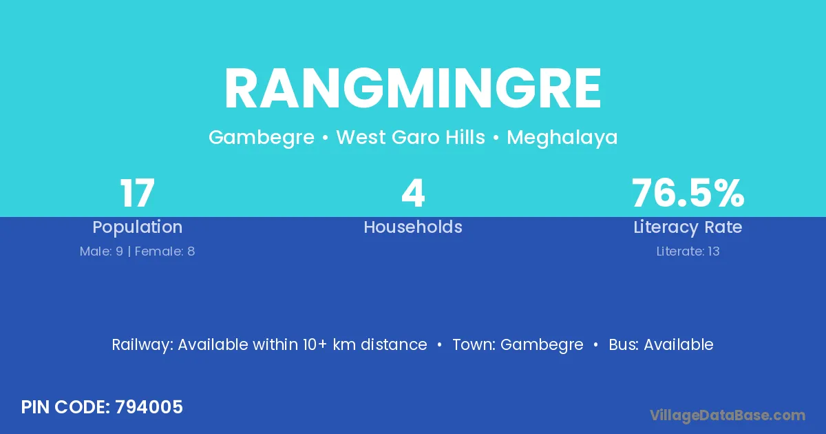 Rangmingre village has a total population of 17 people, of which 9 are males and 8 are females.