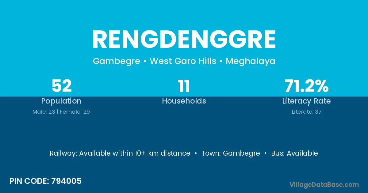 Rengdenggre village has a total population of 52 people, of which 23 are males and 29 are females.
