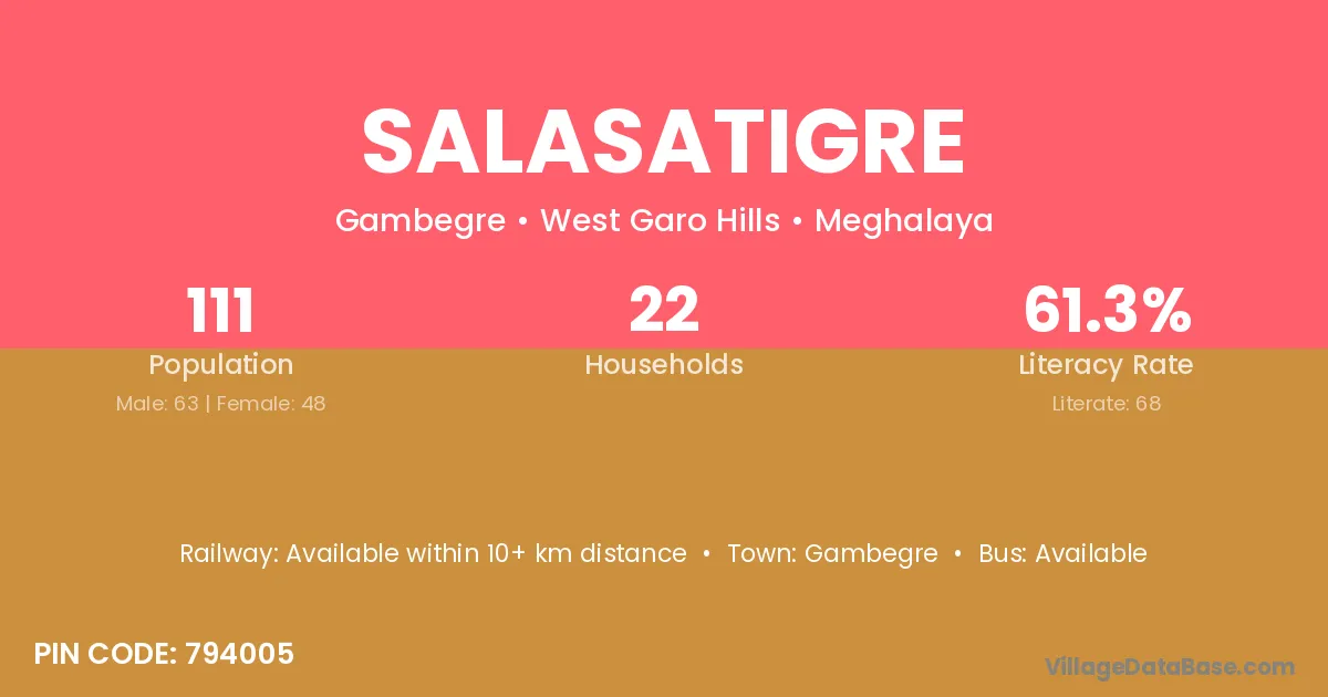 The literacy rate of Salasatigre village is 61.26%. Male literacy stands at 69.84% and female literacy at 50.00%.