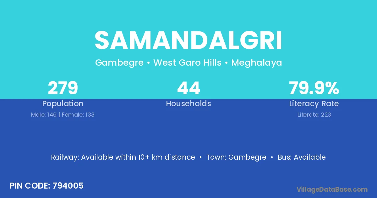 Samandalgri village has a total population of 279 people, of which 146 are males and 133 are females.