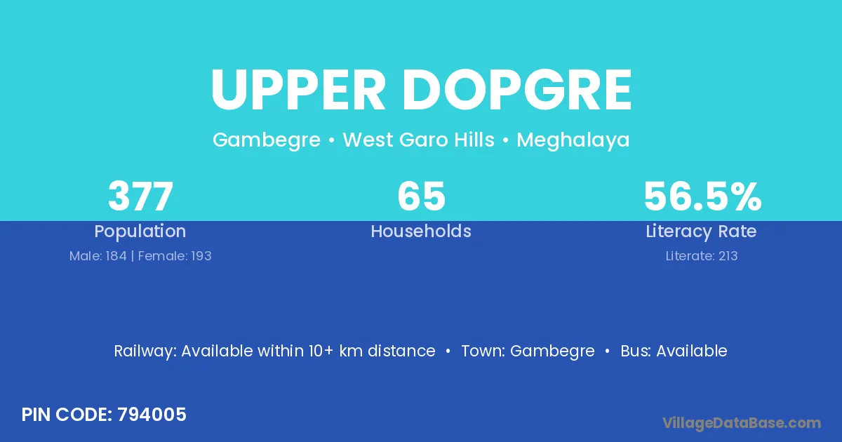 Upper Dopgre village has a total population of 377 people, of which 184 are males and 193 are females.