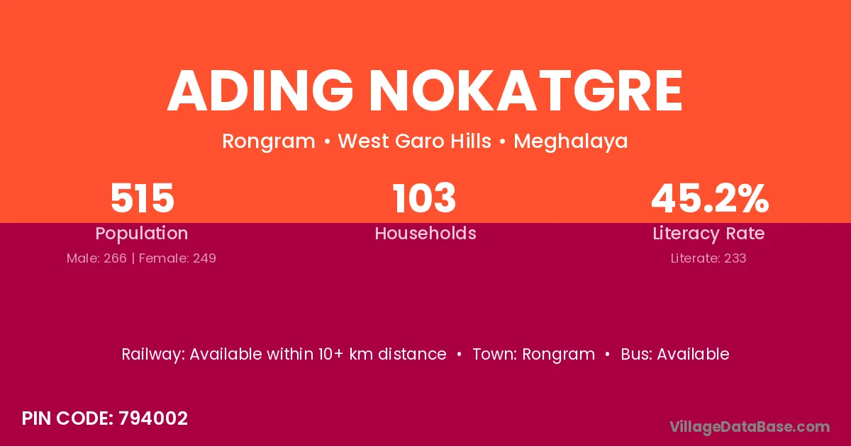 Ading Nokatgre village has a total population of 515 people, of which 266 are males and 249 are females.