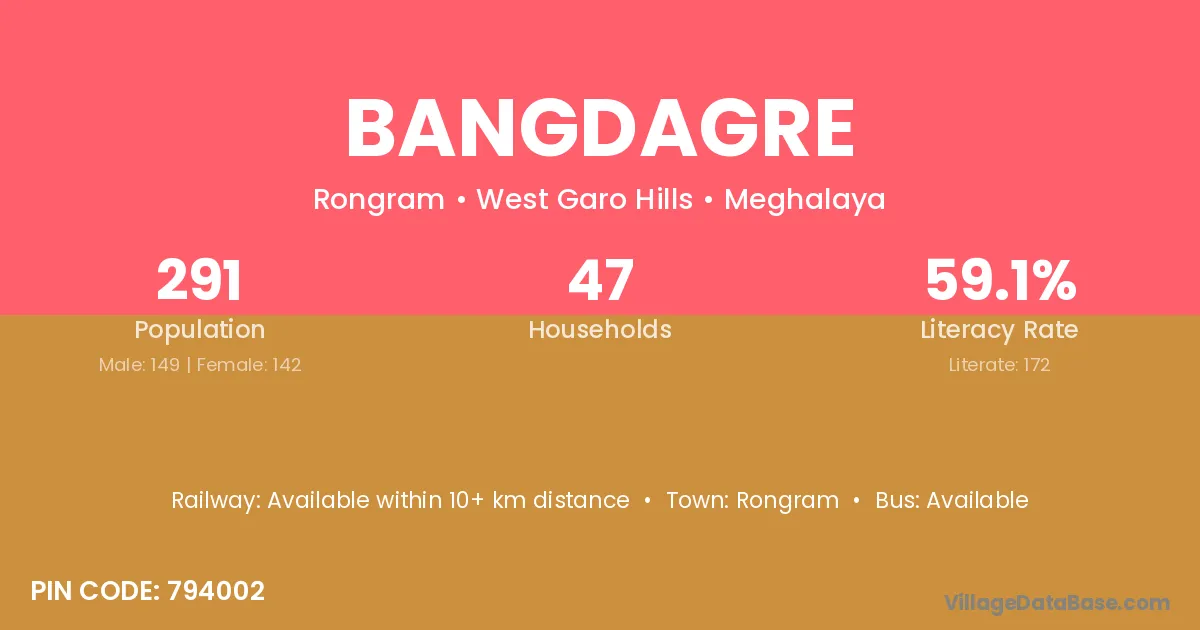 Bangdagre village has a total population of 291 people, of which 149 are males and 142 are females.