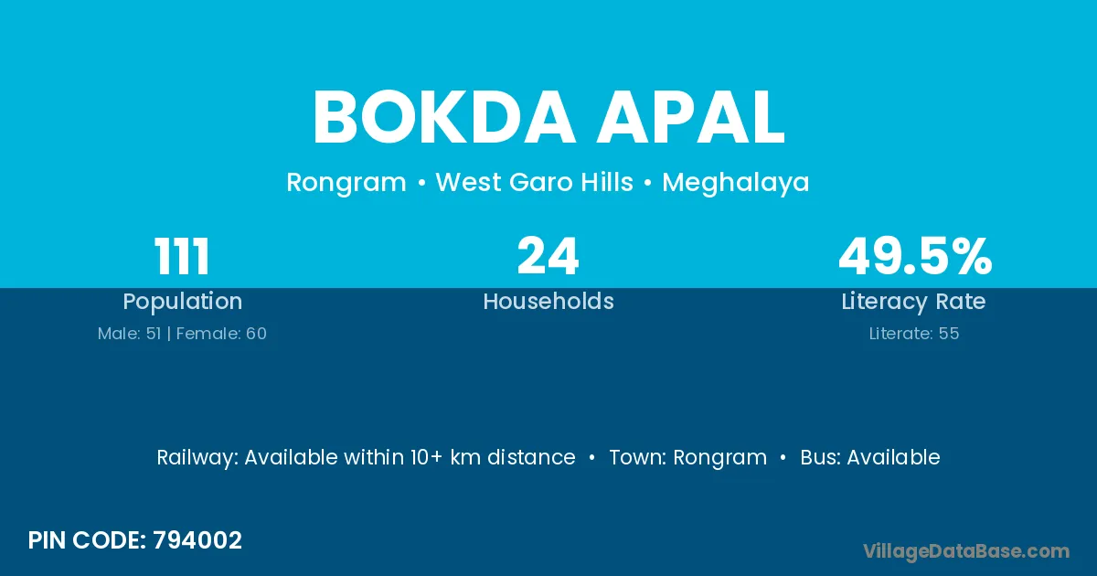 Bokda Apal village has a total population of 111 people, of which 51 are males and 60 are females.
