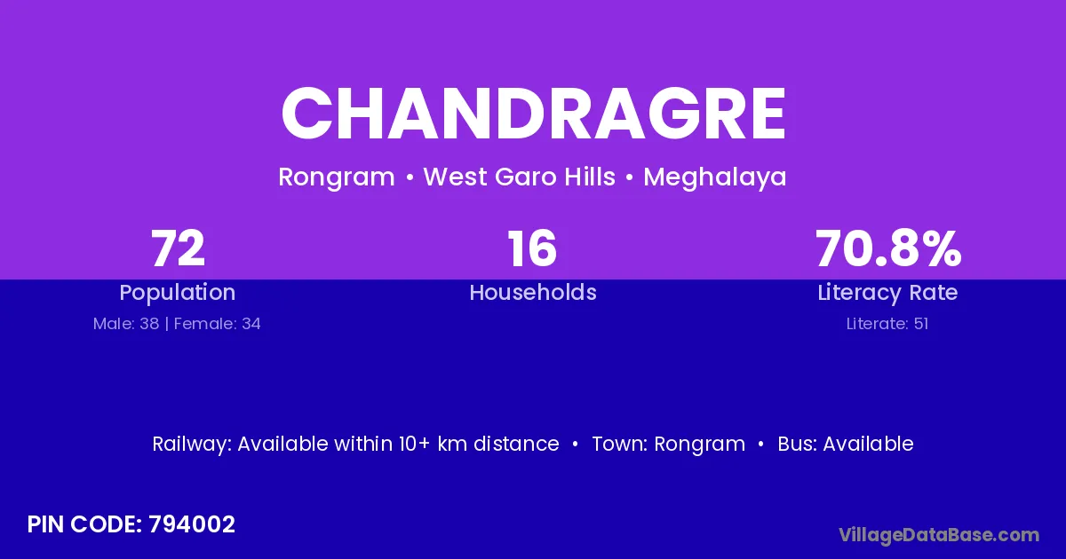 Chandragre village has a total population of 72 people, of which 38 are males and 34 are females.