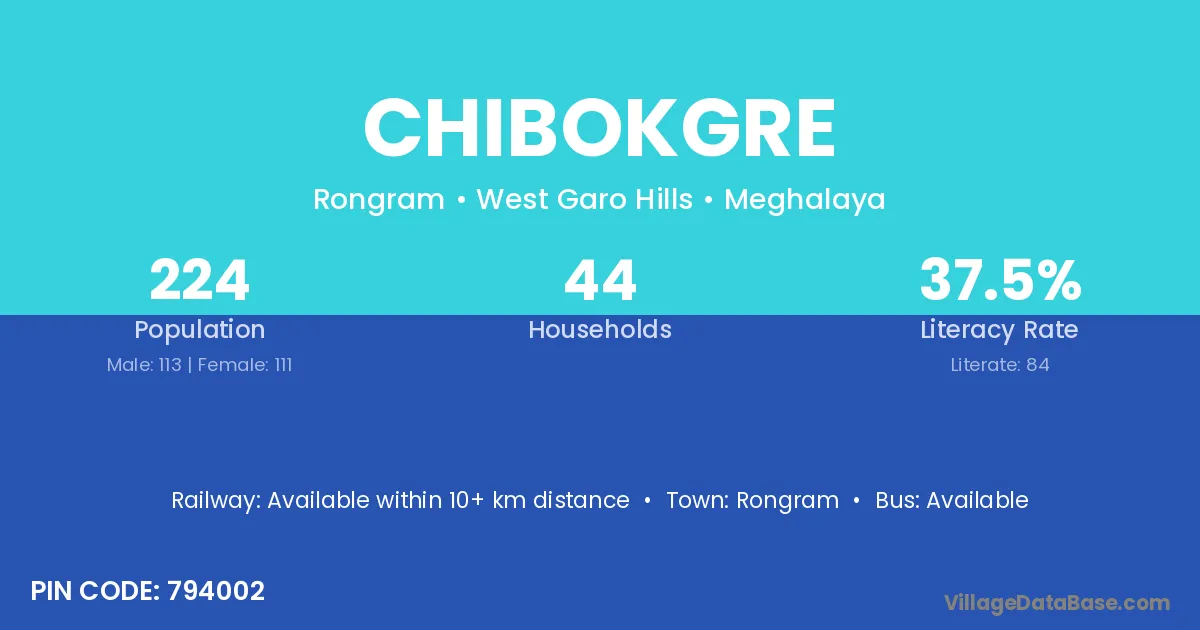 Chibokgre village has a total population of 224 people, of which 113 are males and 111 are females.