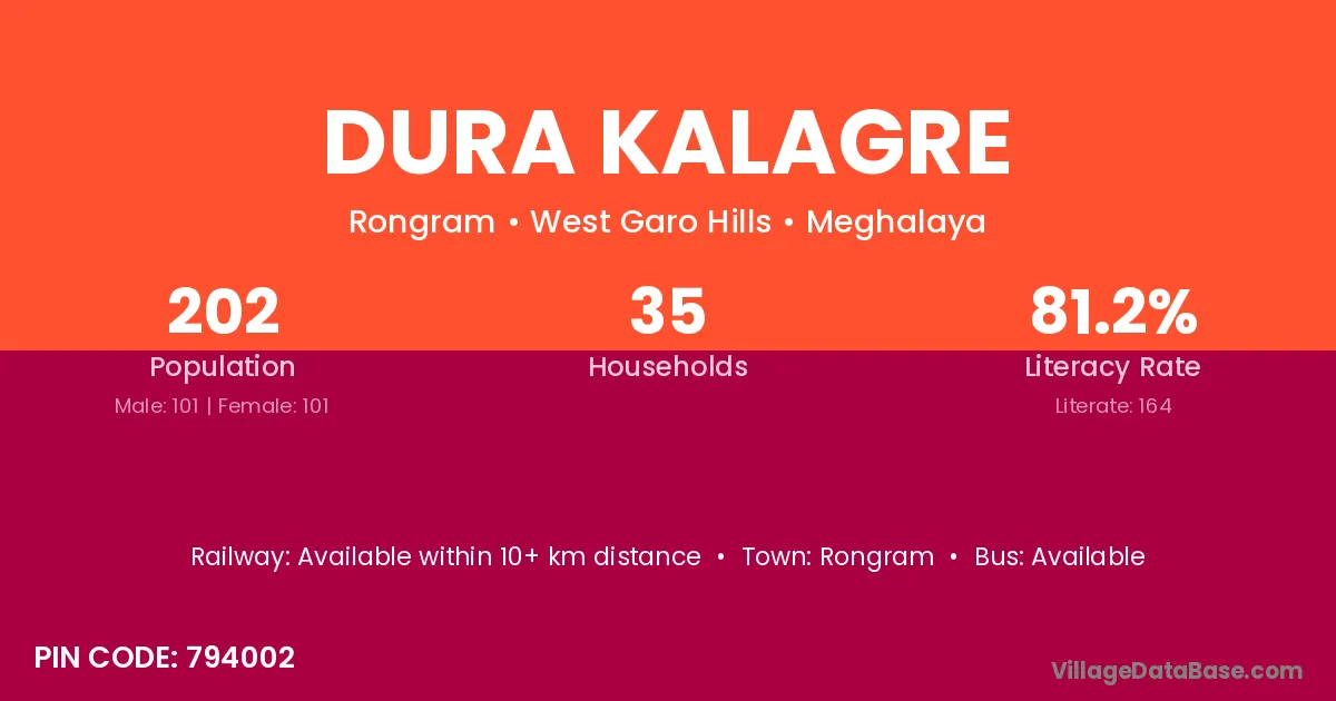 Dura Kalagre village has a total population of 202 people, of which 101 are males and 101 are females.