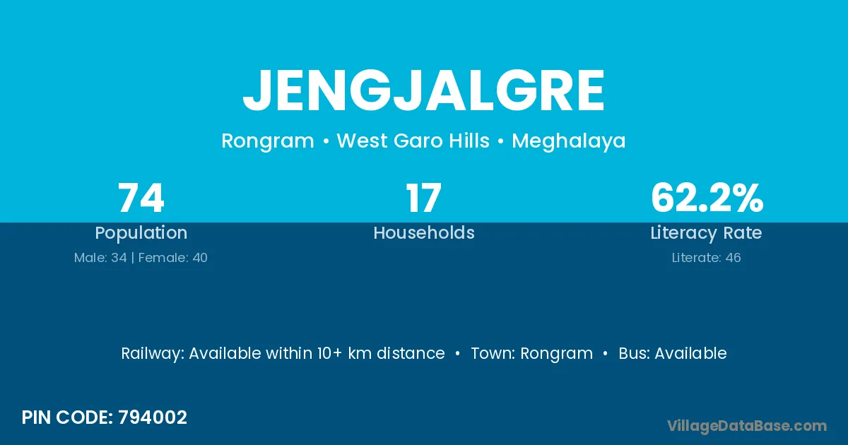 Jengjalgre village has a total population of 74 people, of which 34 are males and 40 are females.