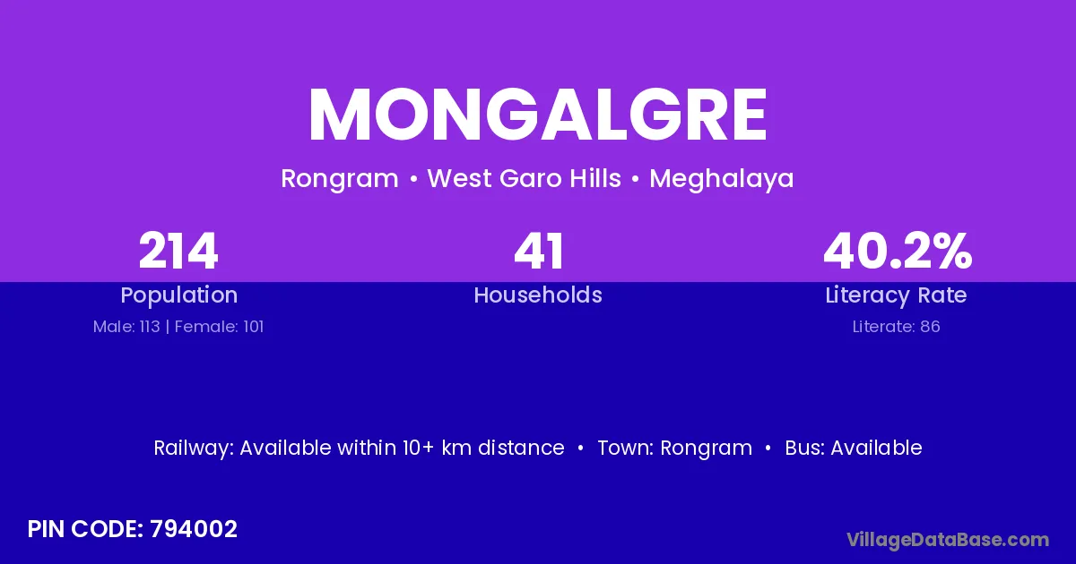 Mongalgre village has a total population of 214 people, of which 113 are males and 101 are females.