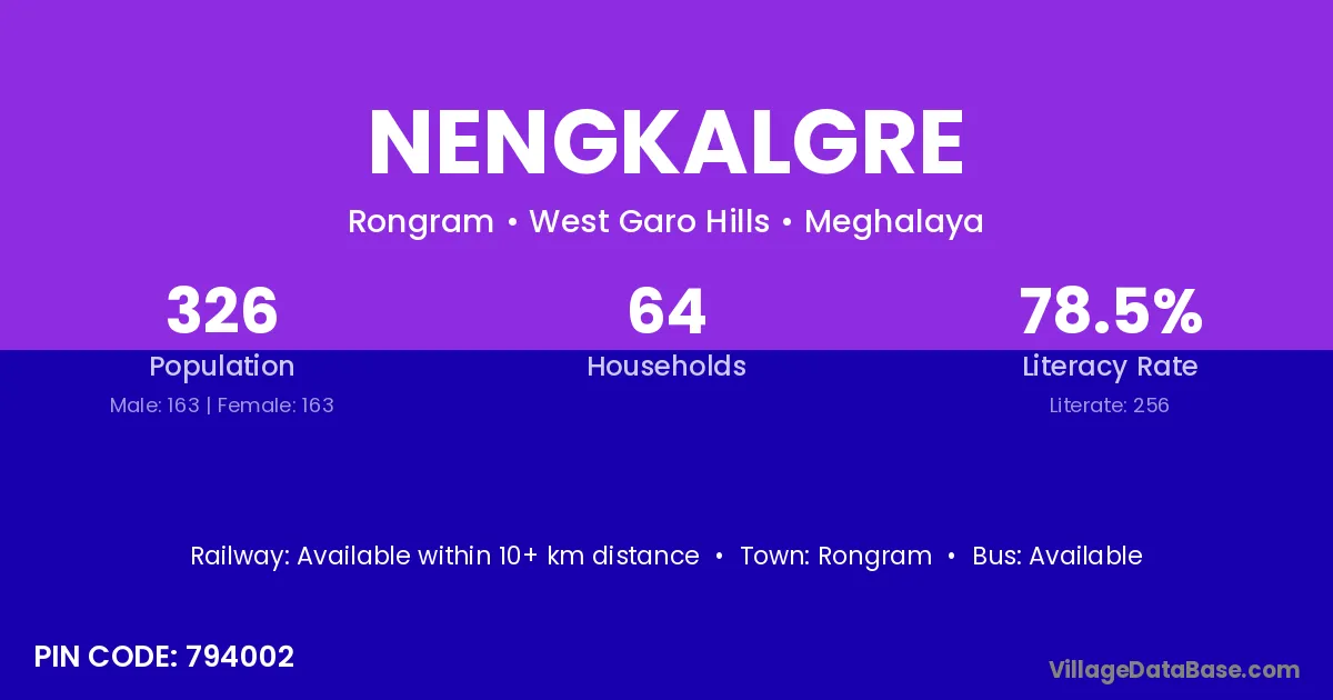Nengkalgre village has a total population of 326 people, of which 163 are males and 163 are females.